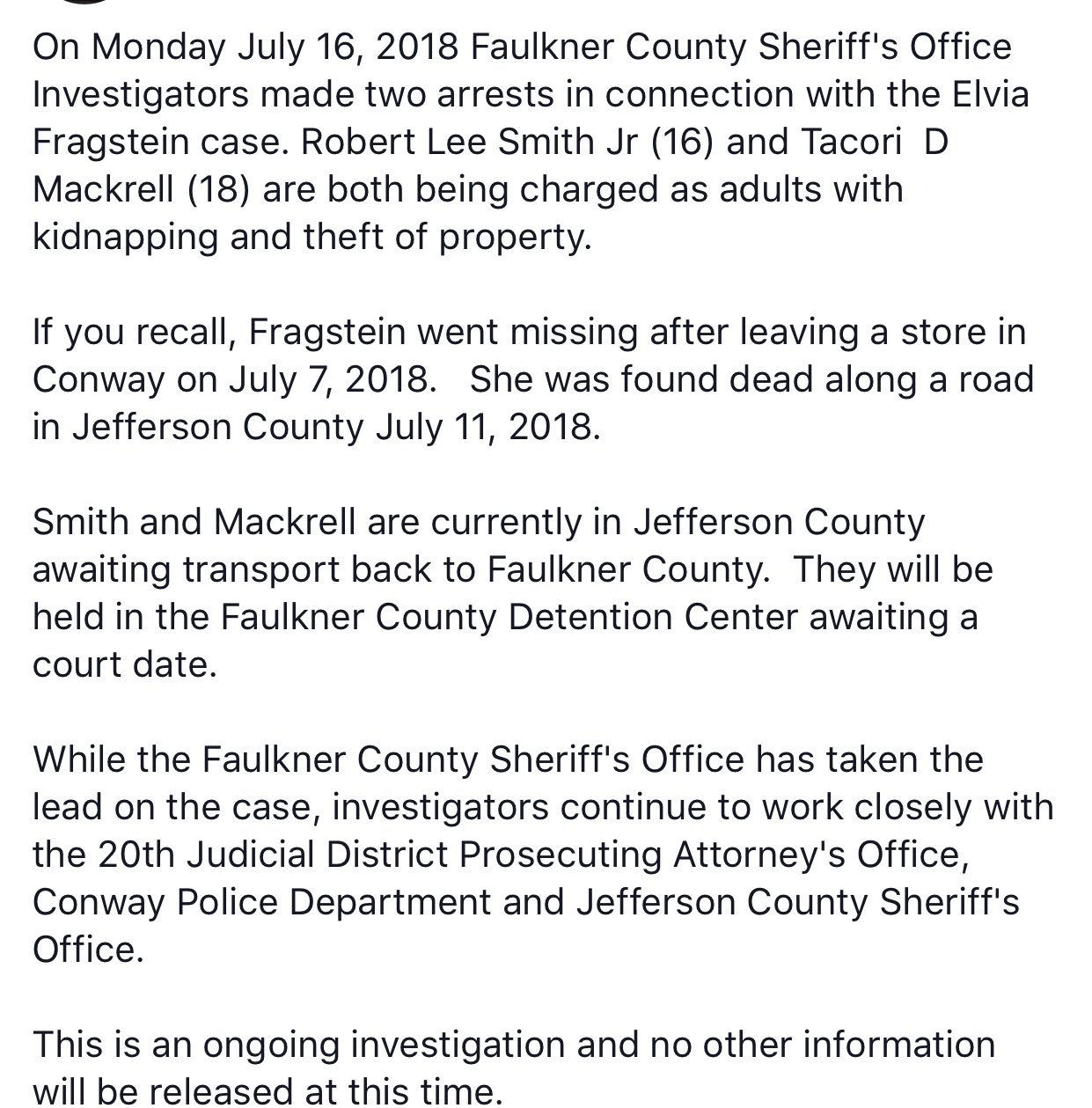 Mitchell Mccoy On Twitter Breakiing 16 Year Old And 19 Year Old Charged With Kidnapping And Theft Of Property In The Disappearance Of 71 Year Old Elvia Fragstein Woman Who Was Found Dead In Jefferson County Arnews Https T Co Sfqmy4cjrd